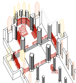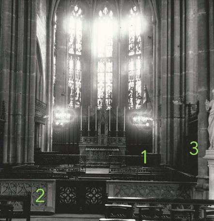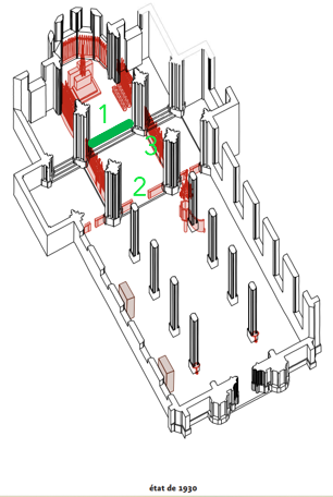 L’objectif est triple (cf. photos ci-dessus et schéma ci-dessous) : (1) remettre la grille de Communion à sa place d’origine en haut des trois marches du chœur (avantages : supprimer le banc de Communion en bois qui a été rajouté, gagner de la place à la croisée du transept, ouvrir davantage la vue sur l’autel), (2) remettre les cancels en pierre à leur place d’origine à l’entrée de la croisée du transept (avantage : garder un deuxième point de Communion), (3) remettre les « palissades » en bois qui ferment actuellement les chapelles de la Sainte Vierge Marie et de sainte Catherine d’Alexandrie à leur place d’origine (avantages : retrouver l’unité des boiseries avec celles du chœur et des stalles, centrer le regard vers l’autel lorsque l’on est proche de la croisée du transept, reculer la chorale dans la chapelle de sainte Catherine et gagner de l’espace pour circuler dans l’église, réouvrir les deux chapelles latérales), et nous ajoutons un quatrième chantier (4) : restaurer et redorer certains vases sacrés de l’église (ciboires notamment).