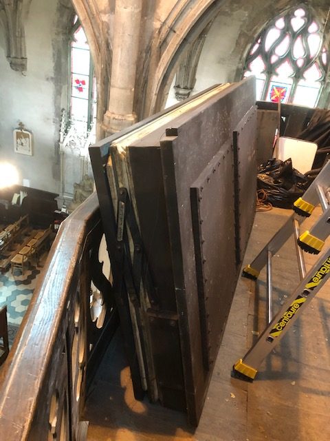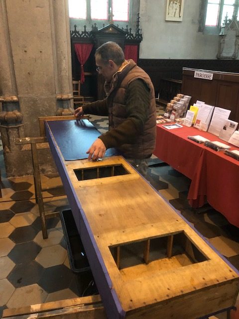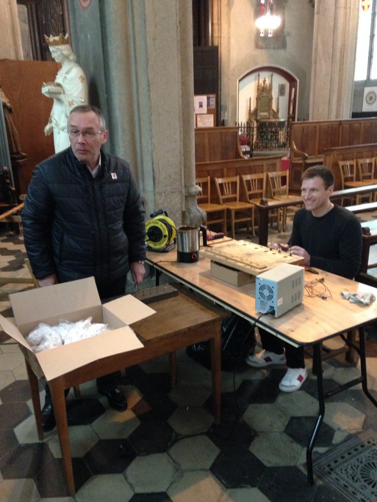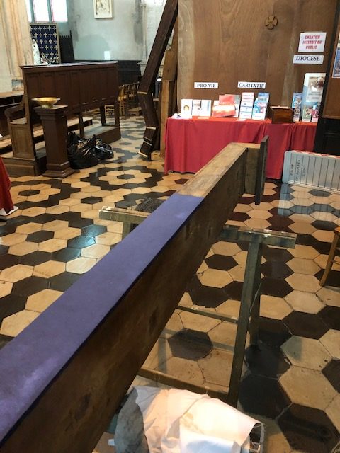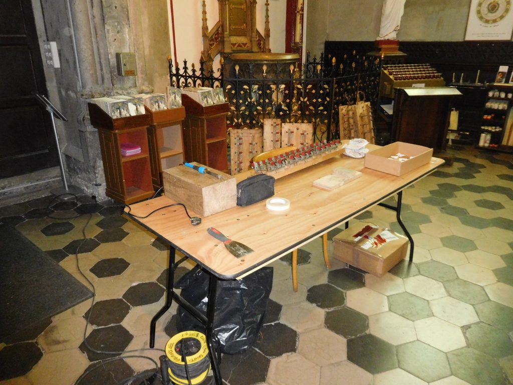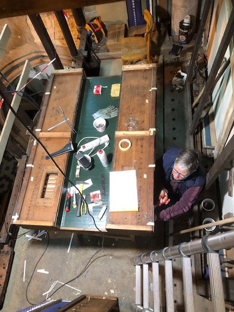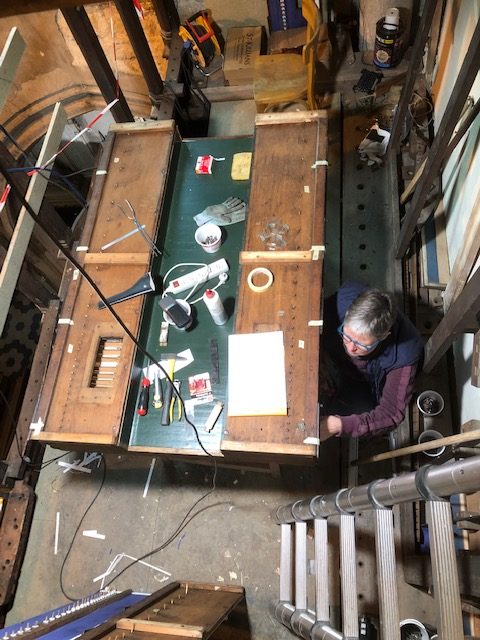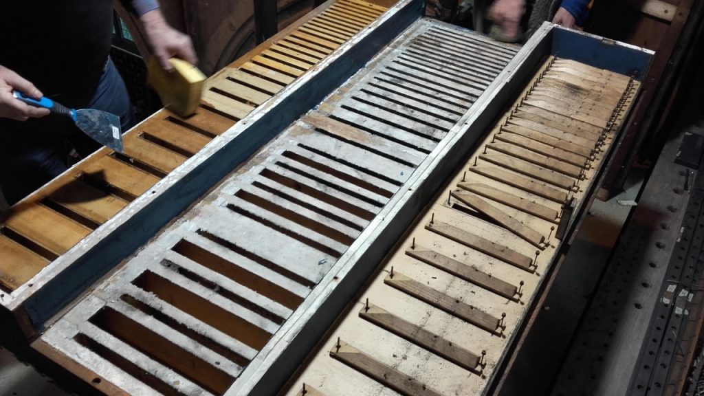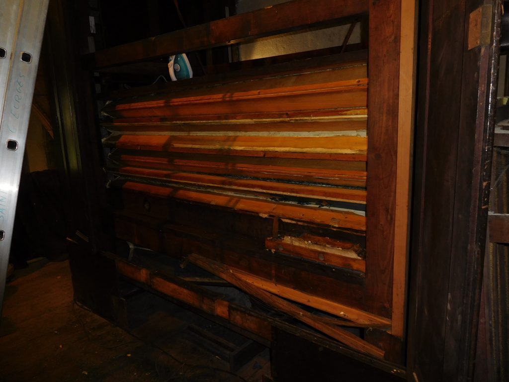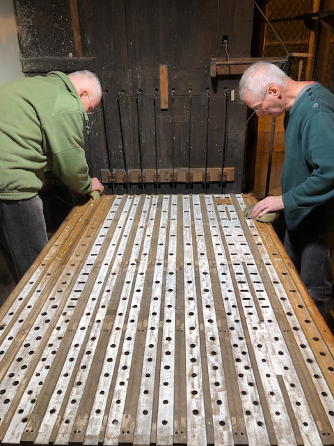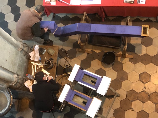 Les travaux ont commencé ! Une semaine active pour tout démonter, stocker les tuyaux (environ 1000) en bas de la tribune, et emporter en Alsace une partie des pièces (notamment la console) pour être réparées dans l’atelier d’ORGANOTECH.